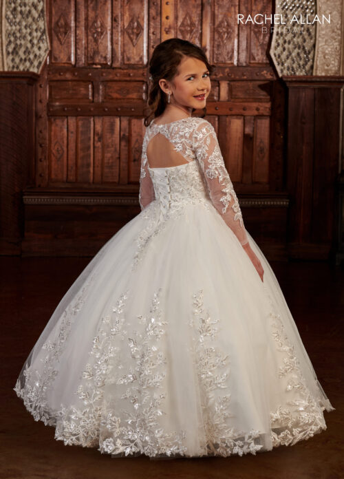 Long sleeve ball gown made of tulle and sequined lace applique featuring sweetheart neck line, keyhole in the back, and lace-up back closure.