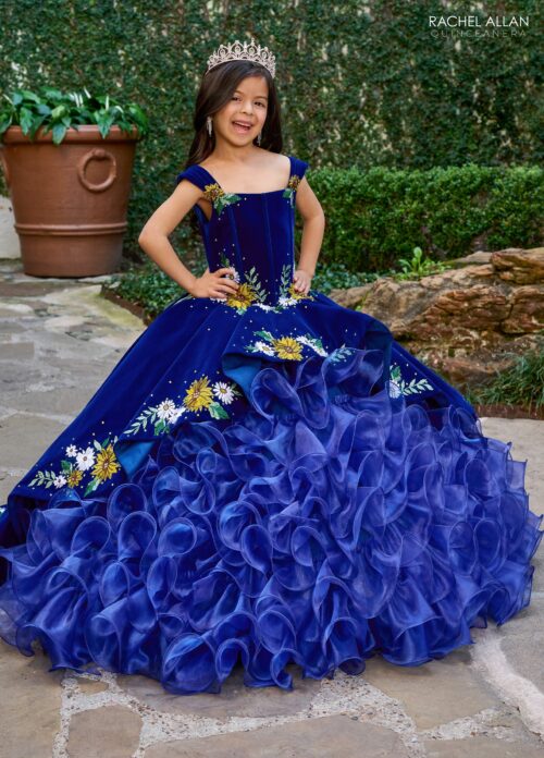 Exude splendor in this captivating Rachel Allan gown. The satin skirt, layered with glitter tulle, is adorned with intricate gold appliqué and beading, creating a majestic and opulent look. The corset bodice, enhanced with delicate 3D floral details, flatters your silhouette, while the voluminous skirt and detachable bow offer a touch of drama. Perfect for quinceañeras or grand events, this gown ensures you’ll radiate confidence and elegance as you make an unforgettable entrance.